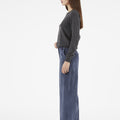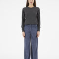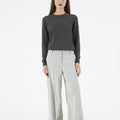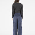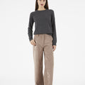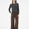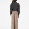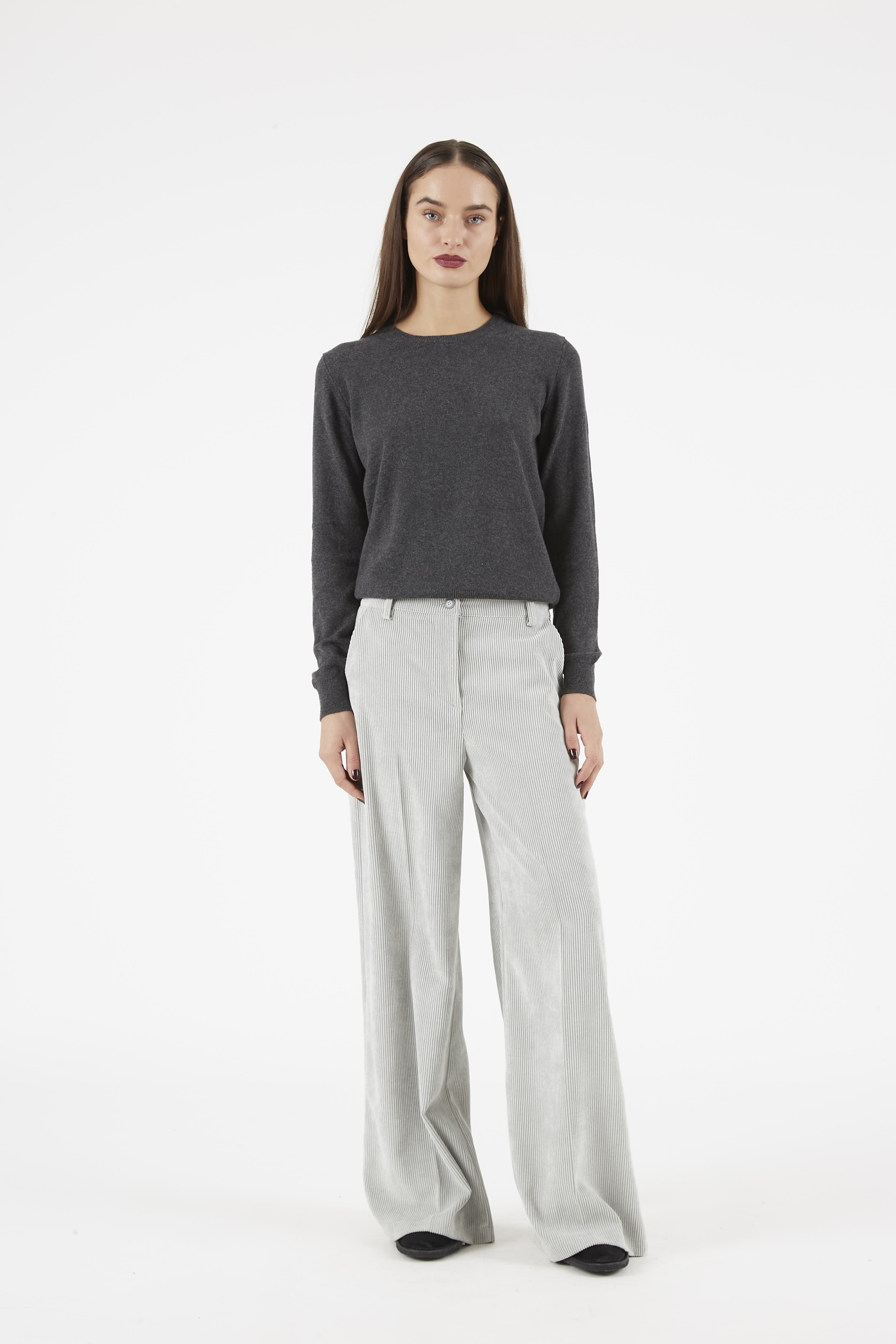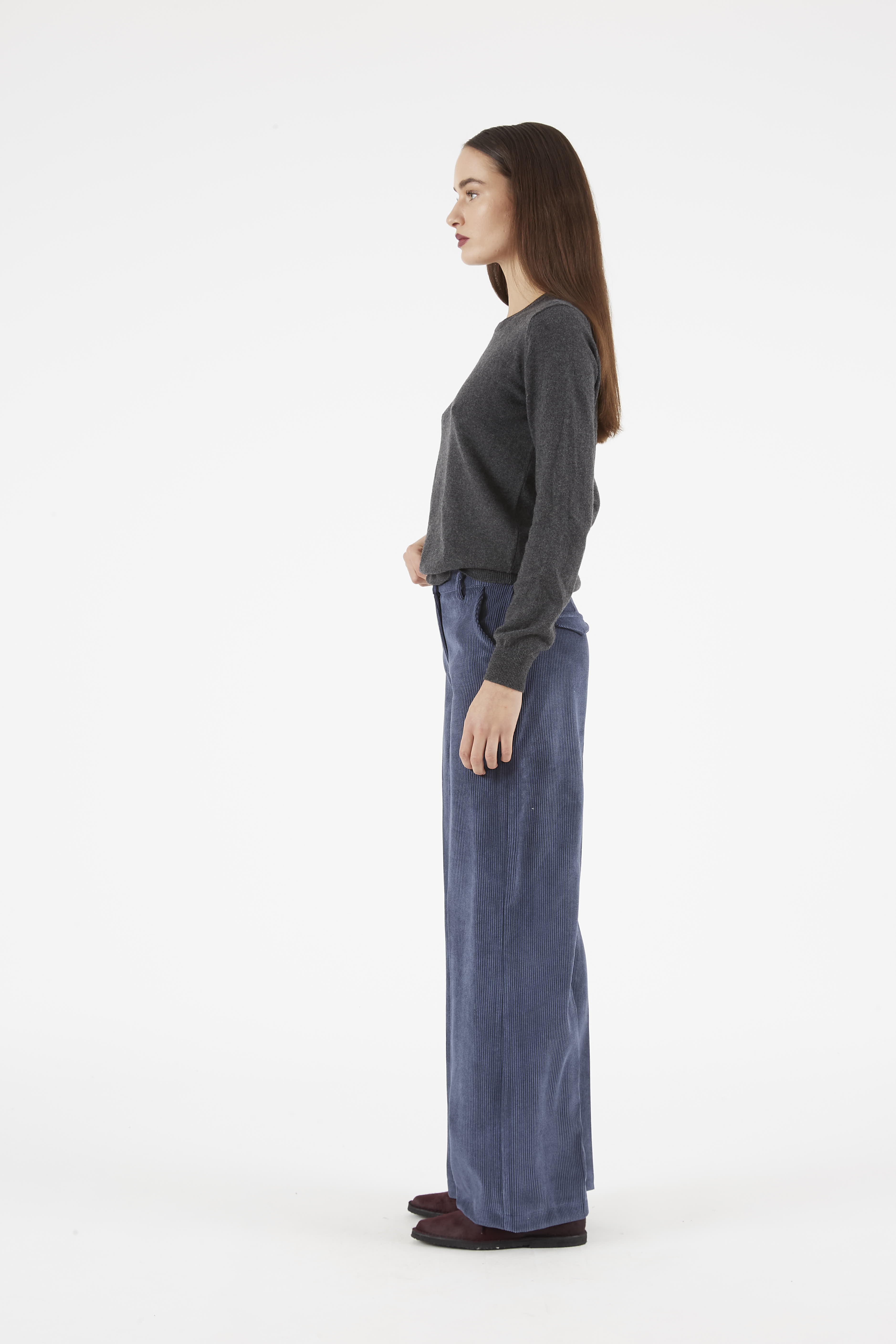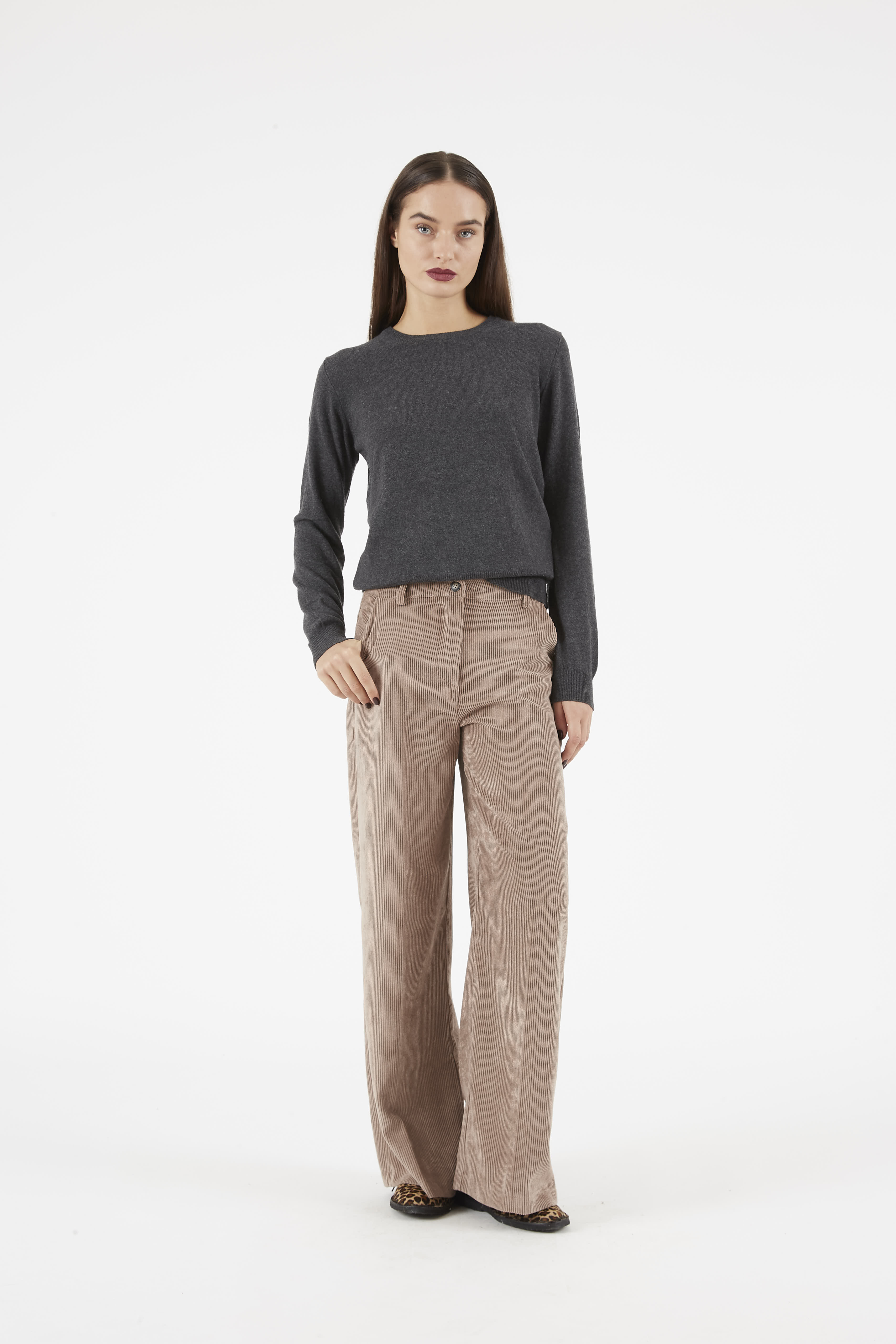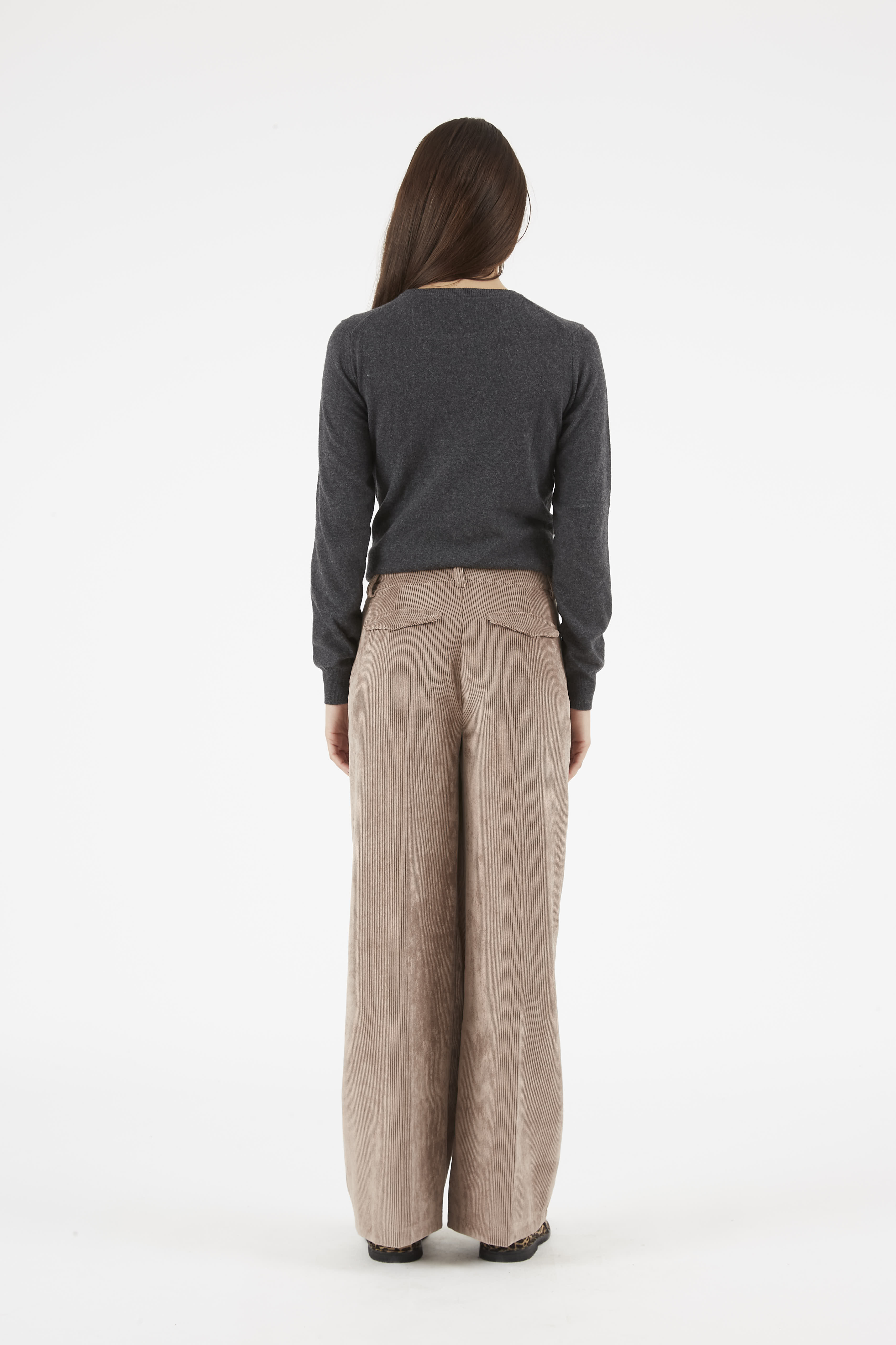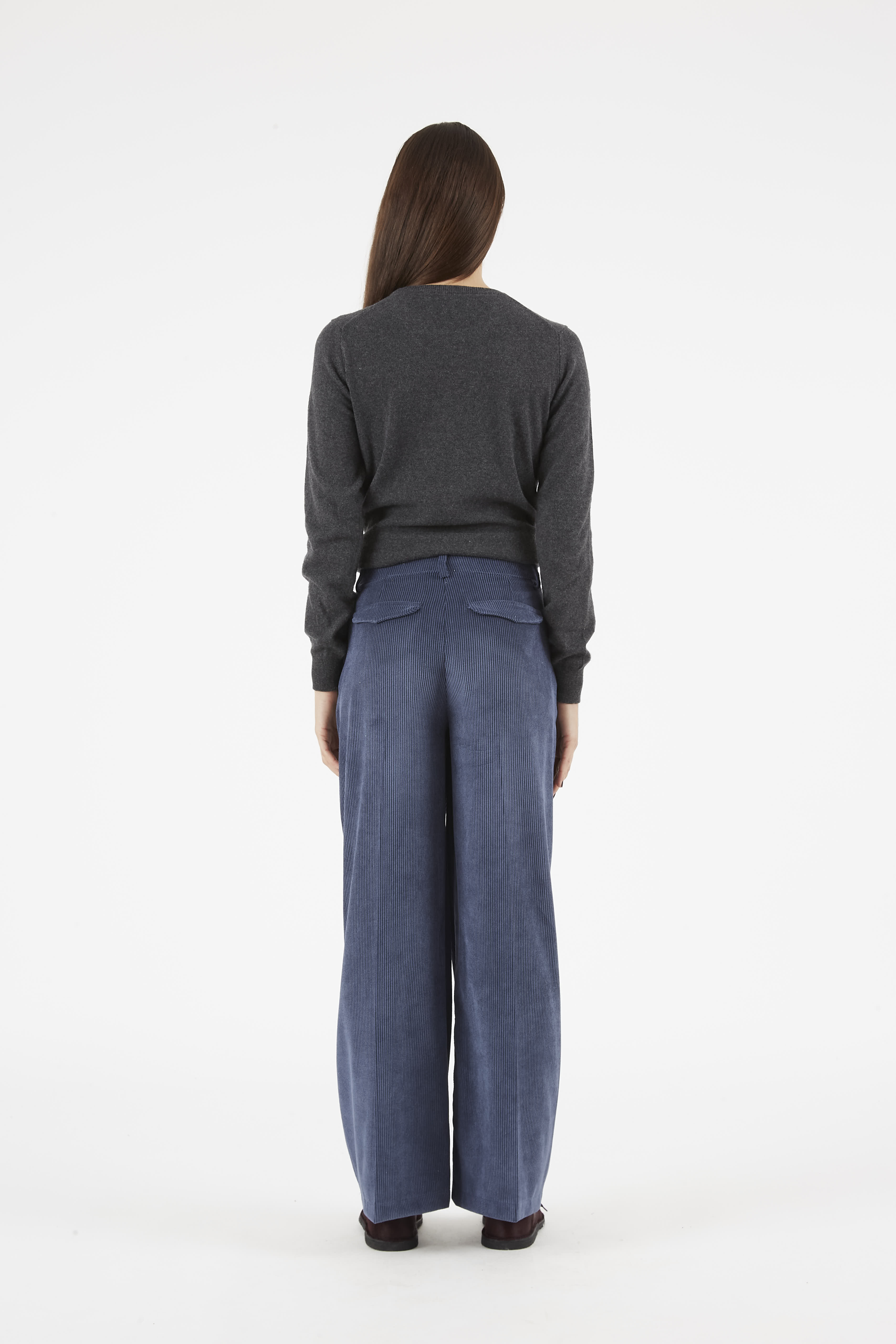 Pantalone in velluto. Modello 5 tasche. Vita alta. Chiusura frontale con zip e bottone.